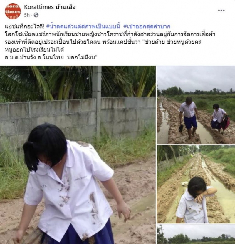 โลกโซเชียลแชร์ภาพนักเรียนชายหญิงชาวโคราชที่กำลังสาละวนอยู่กับการจัดการเสื้อผ้ารองเท้าที่ติดอยู่เปรอะเปื้อนไปด้วยโคลน พร้อมแคปชั่นว่า ช่วยด้วย ช่วยหนูด้วยคะหนูออกไปโรงเรียนไม่ได้ อ.บ.ต.บ้านวัง อ.โนนไทย บอกไม่มีงบ