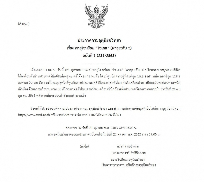 เมื่อวันที่ 21 ต.ค. กรมอุตุนิยมวิทยา ออกประกาศเรื่อง พายุโซนร้อน โซเดล (พายุระดับ 3) ฉบับที่ 1 ลงวันที่ 21 ตุลาคม 2563 โดยระบุว่า