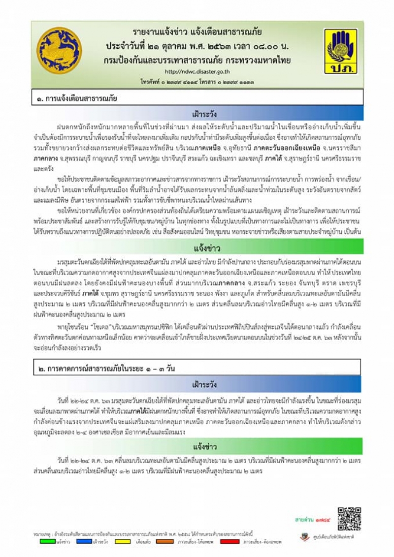 กรมป้องกันและบรรเทาสาธารณภัย หรือ ปภ. รายงานแจ้งข่าว แจ้งเตือนสาธารณภัย ประจำวันที่ 21 ตุลาคม 2563" ฝนตกหนักถึงหนักมาก หลายพื้นที่ในช่วงที่ผ่านมา ส่งผลให้ระดับน้ำและปริมาณน้ำในเขื่อนหรืออ่างเก็บน้ําเพิ่มขึ้น จําเป็นต้องมีการระบายน้ําเพื่อรองรับน้ำที่จะไหลลงมาเพิ่มเติม กอปรกับน้ำท่ามีระดับเพิ่มสูงขึ้นต่อเนื่อง ซึ่งอาจทําให้เกิดสถานการณ์อุทกภัย รวมทั้งขยายวงกว้างส่งผลกระทบต่อชีวิตและทรัพย์สิน บริเวณ