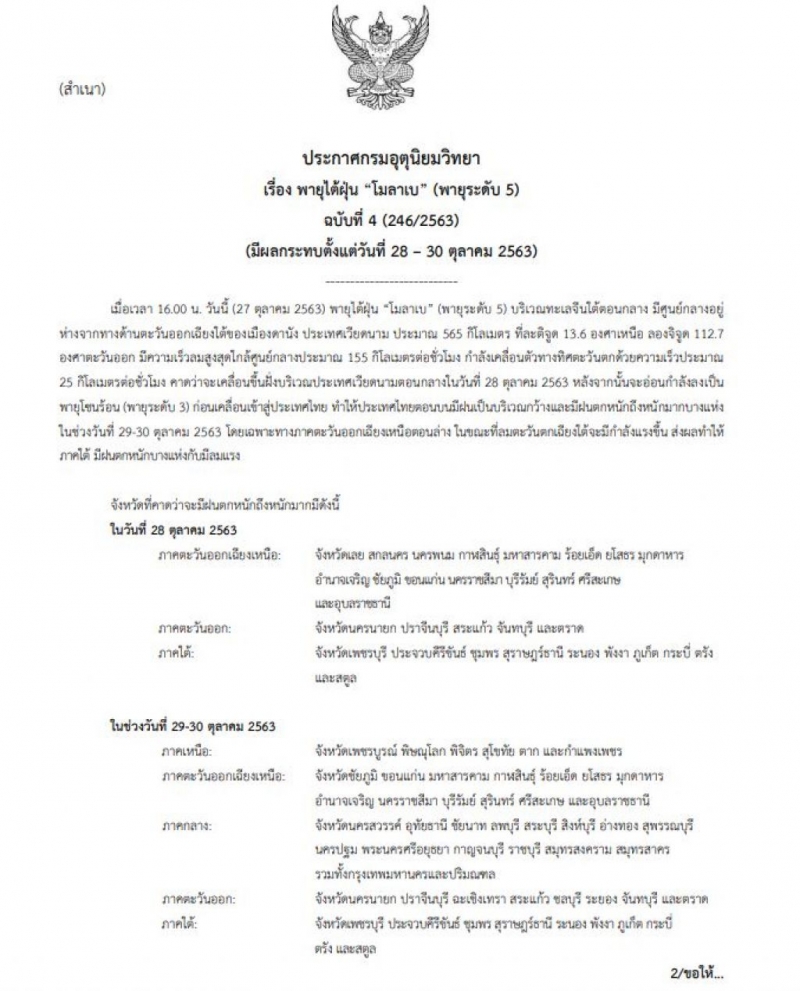กรมอุตุนิยมวิทยาจะออกประกาศฉบับต่อไป ในวันที่ 27 ตุลาคม พ.ศ. 2563 เวลา 23.00 น.