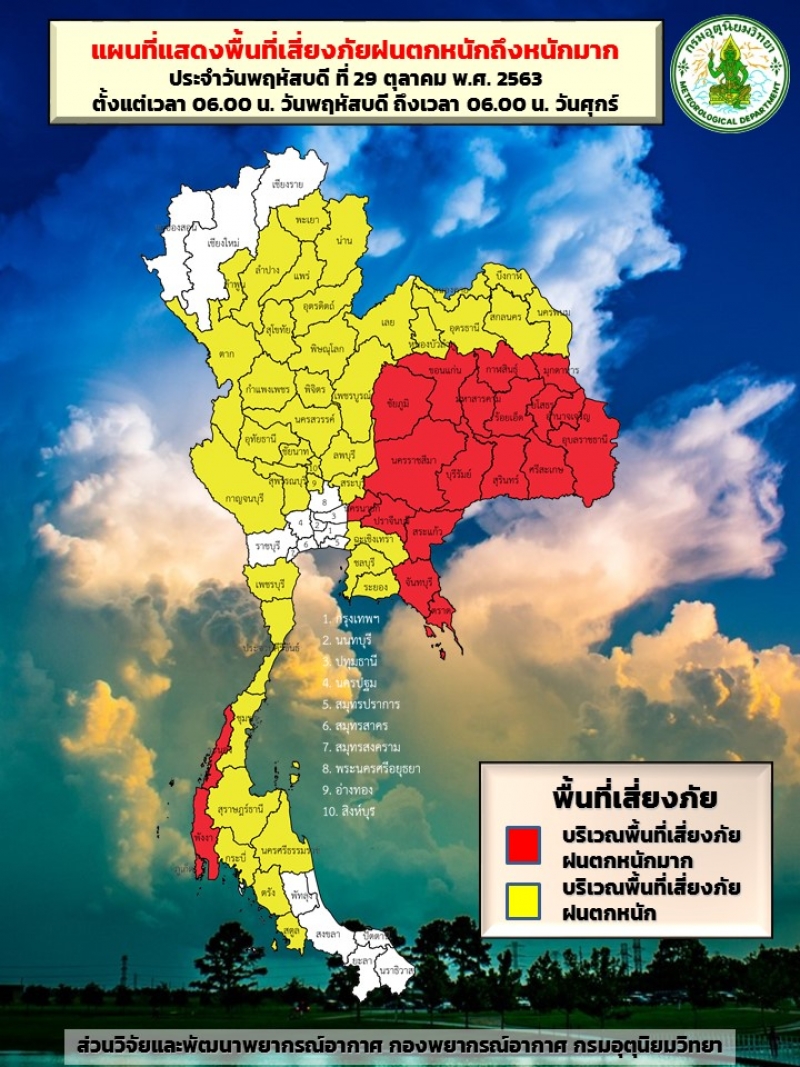กรมอุตุนิยมวิทยา รายงานแผนที่แสดงพื้นที่เสี่ยงภัยฝนตกหนักถึงหนักมาก ประจำวันที่ 29 ตุลาคม 2563 ตั้งแต่เวลา 06.00 น. ถึงเวลา 06.00 น. วันที่ 30 ตุลาคม 2563 โดยจังหวัดที่เป็นพื้นที่เสี่ยงภัย ได้แก่ พะเยา, น่าน, แพร่, ลำปาง, ลำพูน, ตาก, สุโขทัย, อุตรดิตถ์, พิษณุโลก, พิจิตร, กำแพงเพชร, พิจิตร, นครสวรรค์, เพชรบูรณ์, เลย, หนองคาย, บึงกาฬ, นครพนม, สกลนคร, อุดรธานี, หนองบัวลำภู, ชัยภูมิ (พื้นที่สีแดง), ขอนแก่น (พื้นที่สีแดง), กาฬสินธุ์ (พื้นที่สีแดง), มุกดาหาร (พื้นที่สีแดง), ยโสธร (พื้นที่สีแดง), ร้อยเอ็ด (พื้นที่สีแดง), มหาสารคาม (พื้นที่สีแดง), อำนาจเจริญ (พื้นที่สีแดง), อุบลราชธานี (พื้นที่สีแดง), ศรีสะเกษ (พื้นที่สีแดง), สุรินทร์ (พื้นที่สีแดง), บุรีรัมย์ (พื้นที่สีแดง), นครราชสีมา (พื้นที่สีแดง)