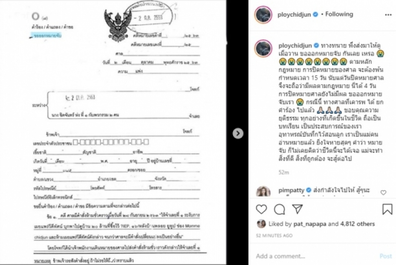ล่าสุดวันนี้ 30 ต.ค. 63 เธอได้โพสต์อีกครั้งในกรณีข้างต้น แต่รอบนี้ทำเธอช็อกหนักกว่าเก่า เมื่อถูกออกหมายจับ โดยระบุว่า ทางทนาย พึ่งส่งมาให้ดูเมื่อวาน ขอออกหมายจับ กันเลย เหรอ ตามหลักกฎหมาย การปิดหมายของศาล จะต้องพ้นกำหนดเวลา 15 วัน นับแต่วันปิดหมายศาล จึงจะถือว่ามีผลตามกฎหมาย นี่ได้ 4 วัน การปิดหมายศาลยังไม่มีผล ขอออกหมายจับเรา กรณีนี้ ทางศาลที่เคารพ ได้ ยกคำร้อง ไปแล้ว ขอบคุณความยุติธรรม ทุกอย่างที่เกิดขึ้นในชีวิต ถือเป็นบทเรียน เป็นประสบการณ์ของเรา อุทาหรณ์บันทึกไว้สอนลูก เราเป็นแม่คน อ่านหมายแล้ว ยิ่งใจหายสุดๆ คำว่า หมายจับ ก็ไม่เคยคิดว่าชีวิตนี้จะได้เจอ แม่จะทำสิ่งที่ดี สิ่งที่ถูกต้อง จะสู้ต่อไป