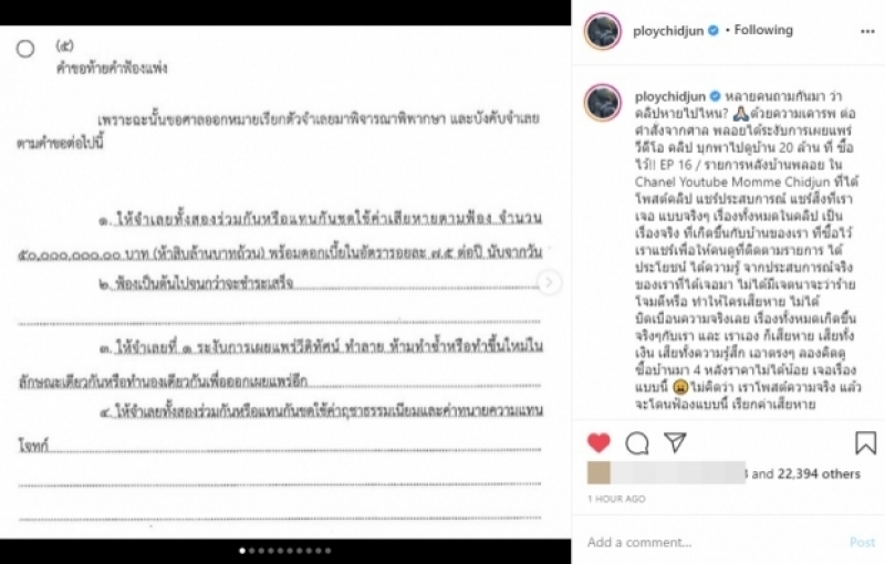 วันที่ 27 ต.ค. 63 ที่ผ่านมา สาวพลอยได้โพสต์หมายเรียกจากศาลที่ถูกฟ้องเรียกค่าเสียหาย 50 ล้านบาท เผยว่า มีคำสั่งจากศาล พลอยได้ระงับการเผยแพร่ วีดีโอ คลิป บุกพาไปดูบ้าน 20 ล้าน ที่ ซื้อไว้!! EP 16 / รายการหลังบ้านพลอย ใน Chanel Youtube Momme Chidjun ที่ได้โพสต์คลิป แชร์ประสบการณ์ แชร์สิ่งที่เราเจอ แบบจริงๆ เรื่องทั้งหมดในคลิป เป็นเรื่องจริง ที่เกิดขึ้นกับบ้านของเรา