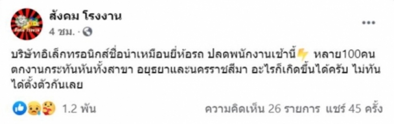 เมื่อวันที่ 30 ตุลาคม 63เพจเฟซบุ๊ก สังคม โรงงาน ได้โพสต์ภาพของพนักงาน พร้อมระบุข้อความว่า 'บริษัทอิเล็กทรอนิกส์ชื่อนำเหมือนยี่ห้อรถ ปลดพนักงานเช้านี้ หลาย 100 คน ตกงานกะทันหันทั้งสาขา อยุธยาและนครราชสีมา อะไรก็เกิดขึ้นได้ครับ ไม่ทันได้ตั้งตัวกันเลย'