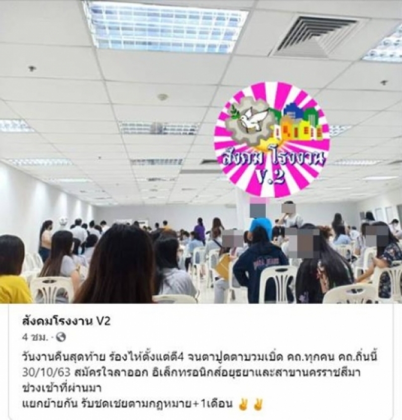 ขณะเดียวกัน เพจ สังคมโรงงาน V2 ยังได้แจ้งข่าวอีกว่า 'วันงานคืนสุดท้าย ร้องไห้ตั้งแต่ตี 4 จนตาปูดตาบวมเบิ่ด คถ.ทุกคน คถ.ถิ่นนี้ 30/10/63 สมัครใจลาออก อิเล็กทรอนิกส์อยุธยาและสาขานครราชสีมา ช่วงเช้าที่ผ่านมา แยกย้ายกัน รับชดเชยตามกฎหมาย+1เดือน