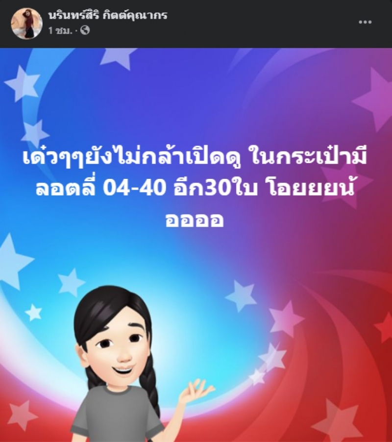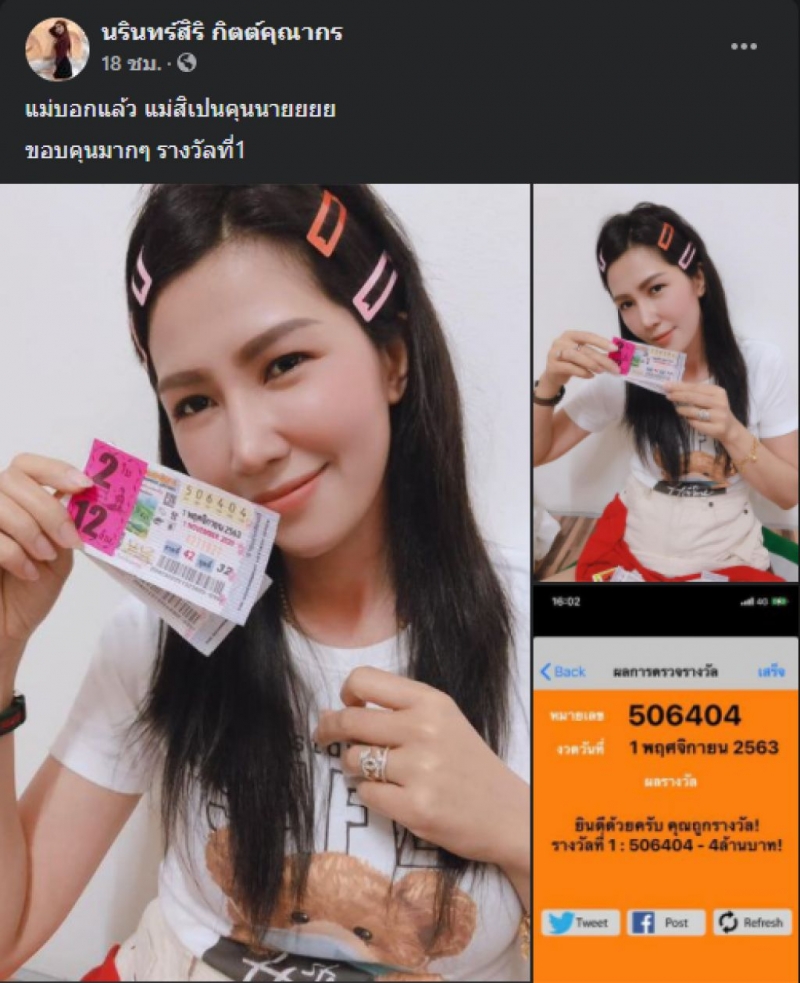ล่าสุดได้มีผู้ใช้เฟซบุ๊กที่ใช้ชื่อว่า นรินทร์สิริ กิตต์คุณากร ได้โพสต์ภาพตนเองถูกรางวัลที่ 1 โดยได้โพสต์ข้อความระบุว่า..."แม่บอกแล้ว แม่สิเป็นคุนนายยยย ขอบคุนมากๆ รางวัลที่1" โดยผู้ใช้เฟซบุ๊กสาวรายนี้นั้น รับโชคไปเต็มๆ 12 ล้าน โดยล่าสุดดูท่าว่าความมหาเฮงของเธอจะยังไม่เหมือนเมื่อเธอลองไปค้นกระเป๋าดู เจอลอตเตอรี่ 04 -40 อีก 30 ใบเรียกว่าซื้อครั้งนี้ครั้งเดียวรับทรัพย์แบบเต็มๆจุกใจกันไปเลย ซึ่งเธอเปิดเผยว่ากว่าที่จะเฮงขนาดนี้เธอนั้นซื้อลอตเตอรี่เป็นจำนวนถึง 70 ใบ