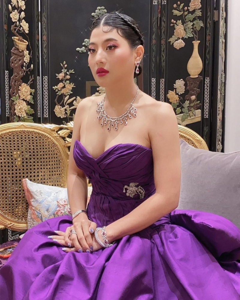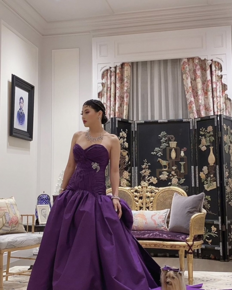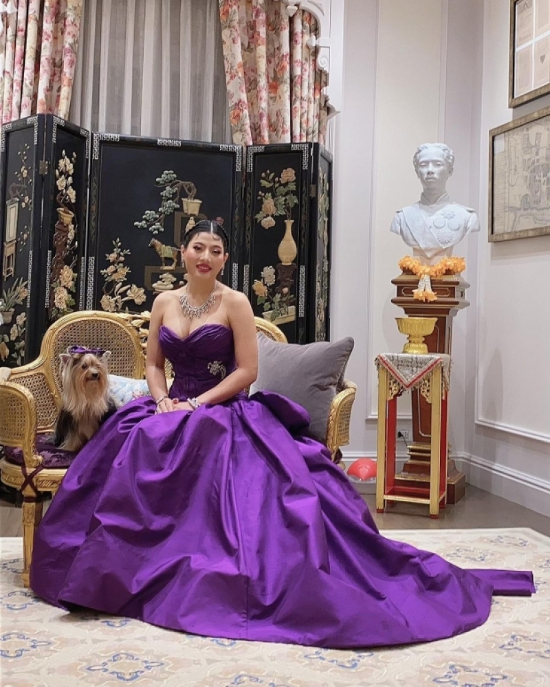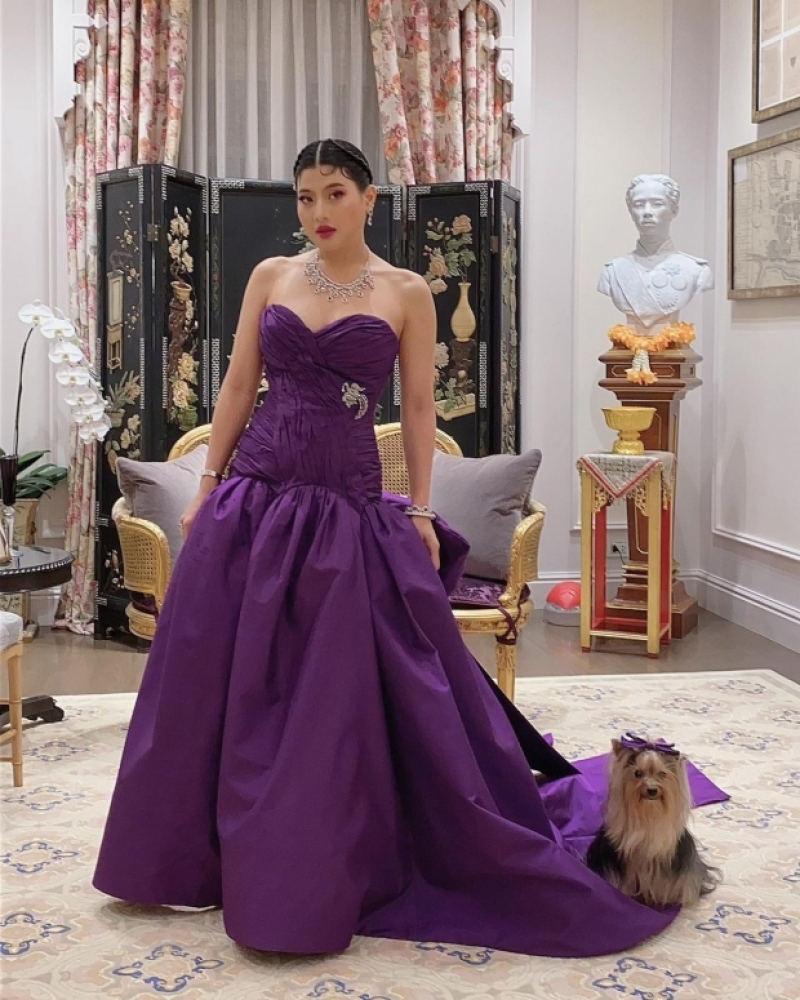 โดยระบุว่า " ฉลองพระองค์ชุดราตรีสีอัญชัน ตัดเย็บจากผ้าไหมน้อยซึ่งเป็นเส้นไหมชั้นในสุดของรังไหมและเป็นเส้นใยที่เกิดจากการสาวไหมด้วยมือจากโครงการศิลปาชีพในสมเด็จพระนางเจ้าสิริกิติ์ พระบรมราชินีนาถ พระบรมราชนนีพันปีหลวง