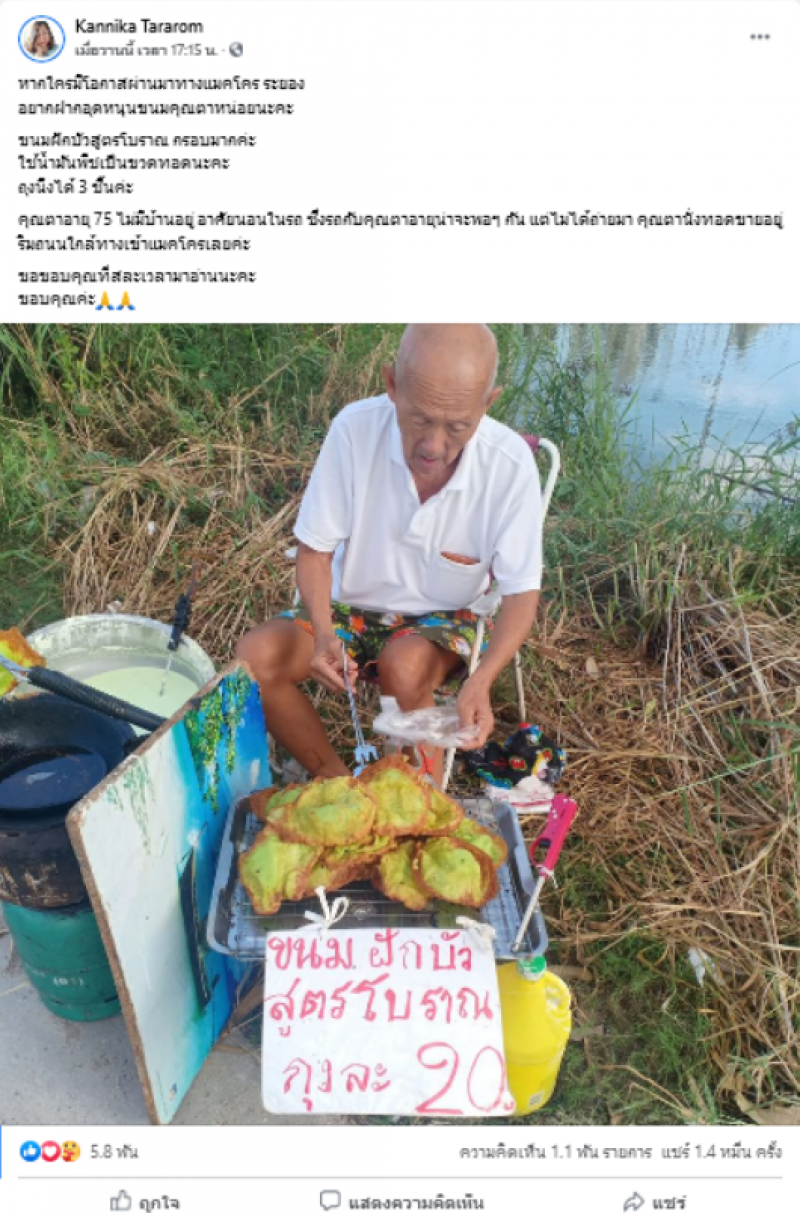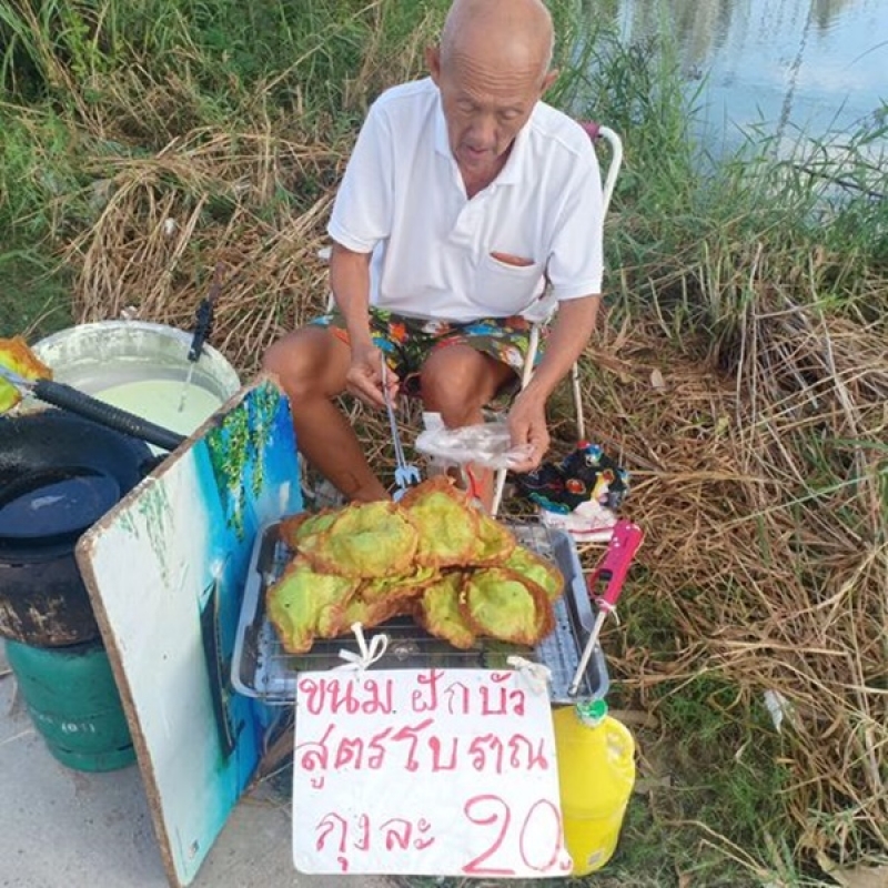 สาวเห็น คุณตาไร้บ้านอยู่ นั่งทอดขนมฝักบัว ก่อนเห็นป้ายรีบแห่อุดหนุน