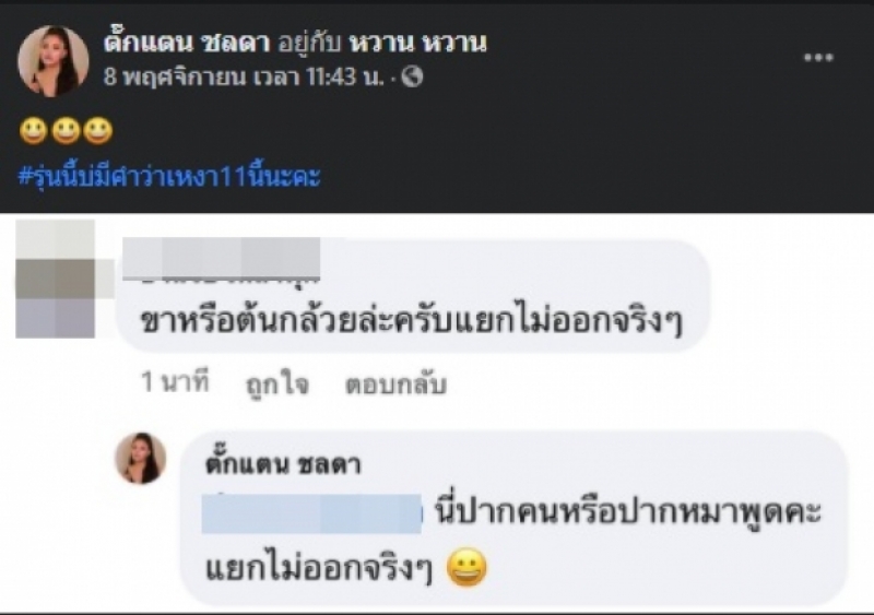 จนกระทั่งสาวตั๊กแตนทนไม่ไหวตอบทันทีว่า นี่ปากคนหรือปากหมาพูดคะแยกไม่ออกจริงๆ โดยเธอก็ได้แคปข้อความเหล่านี้มาโพสต์หน้าเฟซบุ๊ค ระบุแคปชั่นว่า รุ่นนี้บ่มีคำว่าเหงา11นี้นะคะ จนแฟนคลับต่างเข้ามาคอมเมนต์ถล่มผู้ใช้เฟซบุ๊คคนที่นี้อย่างกระหน่ำ
