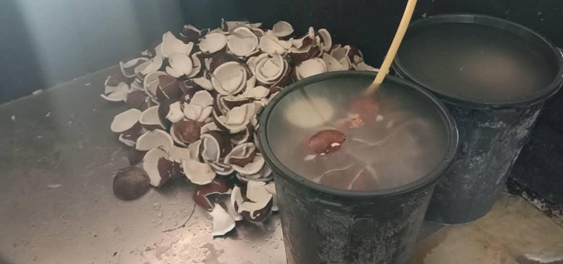 ภาพสกปรกไม่เคยล้าง มะพร้าวที่ปอกเปลือกแล้ววางกองอยู่บนพื้นข้างห้องส้วม บ้างก็แช่อยู่ในถังน้ำสกปรก ตัวสินค้าที่แปรรูปแล้วก็ใส่ถาดวางอยู่บนพื้นโคลนและมีน้ำขัง