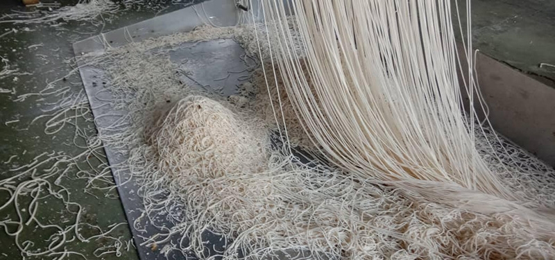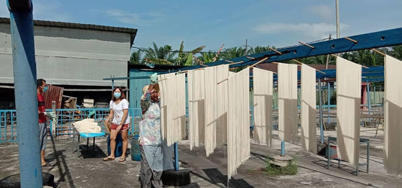 ตัวโรงงานตั้งอยู่ฝั่งตรงข้ามกับฟาร์มเลี้ยงหมู เครื่องผลิตเส้นวางตั้งอยู่บนพื้น มีเส้นก๋วยเตี๋ยวกองเละเทะสุมกันทั้งบนเครื่องและบนพื้น โรงงานไม่มีเครื่องอบแห้ง และใช้วิธีตากแดดในการทำให้เส้นแห้ง ซึ่งตั้งอยู่ในที่เปิดโล่งไม่มีอะไรกั้น ฝุ่นควันและสิ่งสกปรกปลิวมาติดได้ตลอดเวลา ไม่รวมทั้งขี้นกที่ตกลงมา