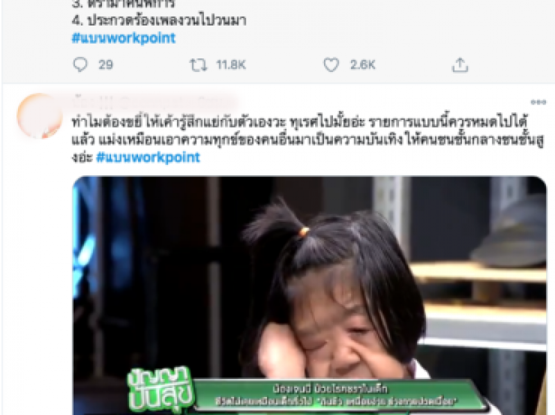 โดยมีคนเข้ามาโพสต์รายการ รายการหนึ่ง ของทางช่องworkpoint อย่างแรงว่ารายการ อะไรวะ ตอกย้ำปมด้อยแขกรับเชิญแบบเปิดรายการมา 3 นาที น้องก็ร้อง แล้วอะ ถามแม่เด็กว่า สำเนียงแปลกๆ เป็นคนที่ไหน ต้อง out of touch ขนาดไหนถึงภูมิใจกับการได้ ratings สูงจากการที่คนออกมาประณามรายการสวะๆแบบนี้ ปัญญาปันสุข สุขมากไหมบนความทุกข์คนอื่น #แบนworkpoint (1)