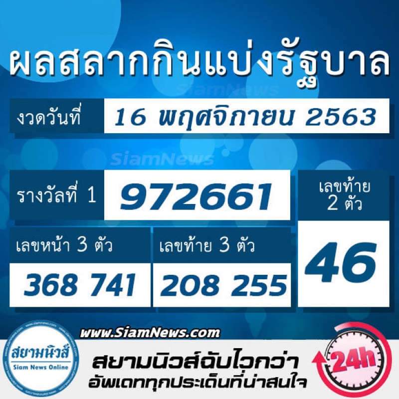 ผ่านไปแล้วสำหรับการประกาศผลสลากกินแบ่งรัฐบาล ประจำวันที่ 16 พฤศจิกายน 2563 รางวัลที่ 1 ออกหมายเลข 972661 ส่วนรางวัล เลขหน้า 3 ตัว ออกหมายเลข 368 และ 741 รางวัลเลขท้าย 3 ตัว ออกหมายเลข 255 และ 208 ขณะที่รางวัลเลขท้าย 2 ตัว ออกหมายเลข 46 เชื่อว่าหลายท่านคงจะกำลังเฮเตรียมเลี้ยงฉลอง