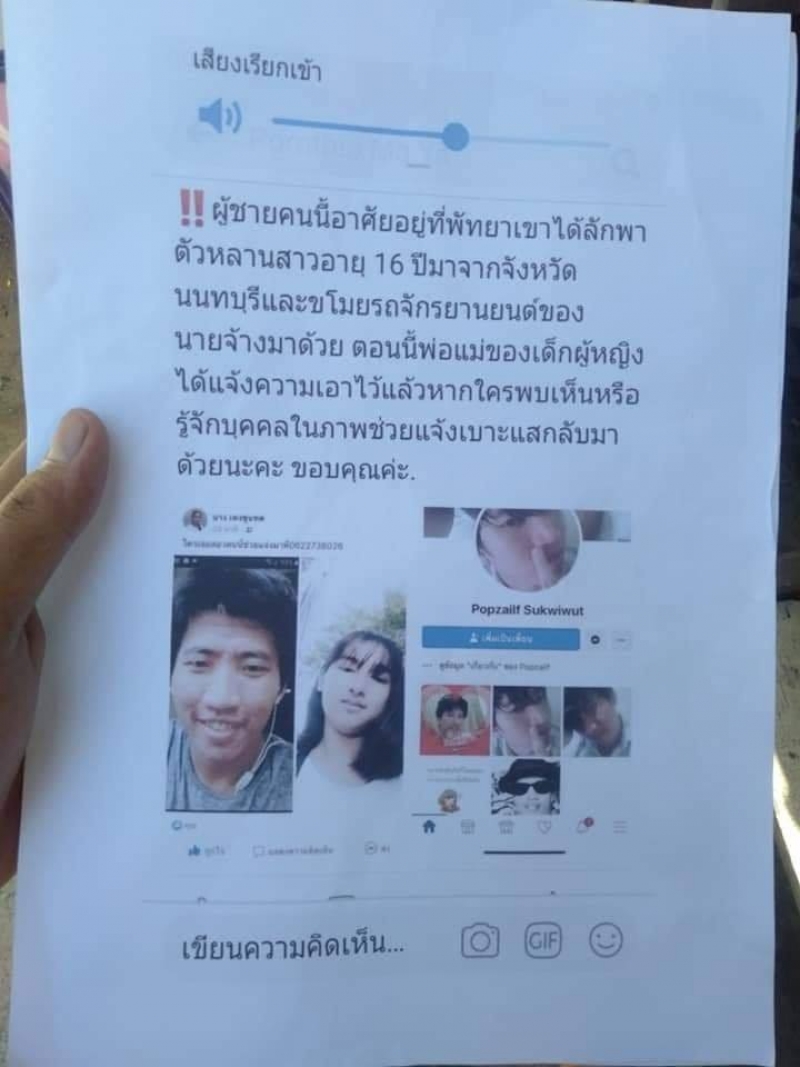 แม่เขามาตามหาลูกสาวอายุ 16 ปี มาจากนนทบุรี (ท่าอิฐ) ผู้ชายในภาพได้ลักพาตัวบุตรสาวเขามาจากนนทบุรีตั้งแต่วันที่ 7 มาที่พัทยา ขโมยรถจักรยานยนต์รุ่น PCXสีดำ ของนายจ้างมาด้วย #ได้แจ้งความไว้แล้ว #ช่วยๆกันแชร์หน่อยน่ะค่ะ สงสารคนเป็นแม่ ขอบคุณทุกคนนะ ใครพบหรือมีเบาะแส โทร 092 7129835 เบอร์ญาติเค้าค่ะ