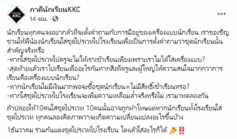 เมื่อวันที่ 27 พฤศจิกายน ภาคีนักเรียนKKC ได้โพสต์เฟซบุ๊ก เชิญชวนนักเรียนไทย ให้ใส่ชุดไปรเวทไปเรียนในช่วงวันเปิดเทอมนี้ โดยระบุว่า