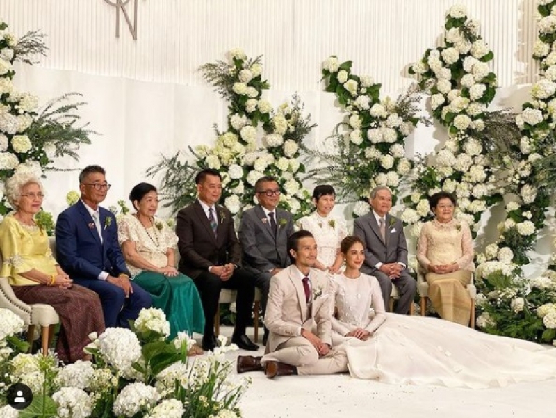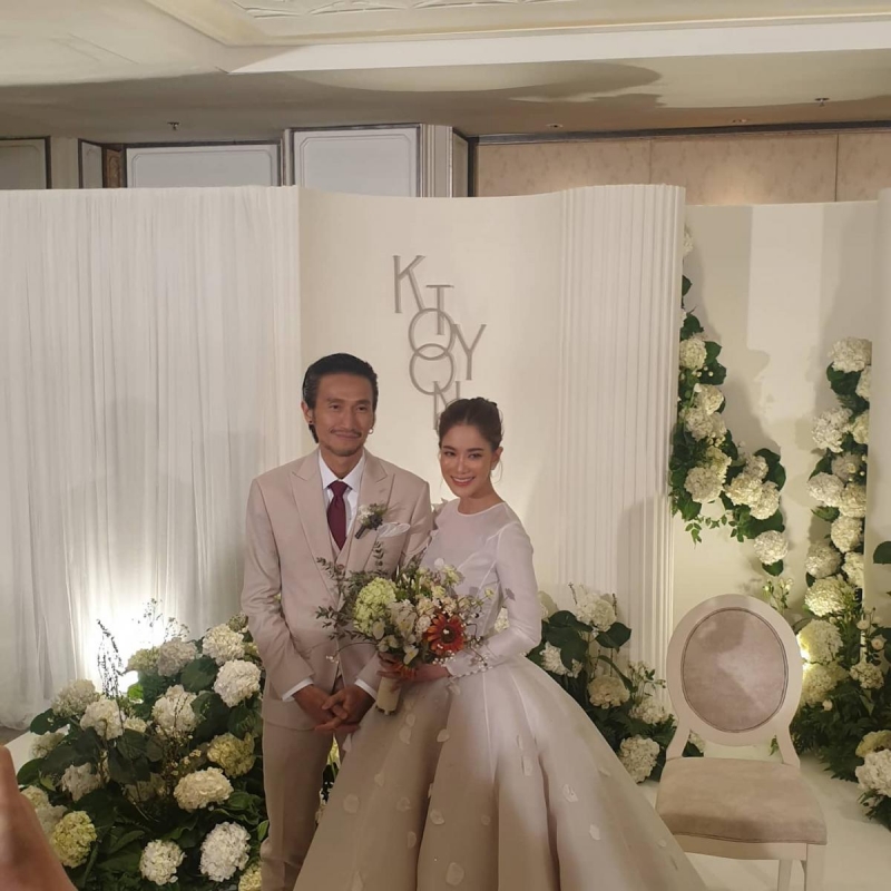 ซึ่งบรรยากาศภายในงานเต็มไปด้วยความอบอุ่นอย่างมาก เจ้าสาวมาในชุดสีขาวกระโปรงยาวสุดสวย ซึ่งภายในงานเต็มไปด้วยความยินดีของญาติๆ คนในครอบครัวและเพื่อนในวงการ ซึ่งจะมีเลี้ยงฉลองในตอนเย็น โดยในเวลา 16.00น. และงานตอนเย็นมาในธีมสวนสนุก ซึ่งเป็นธีมที่เจ้าบ่าวนั้นชอบเป็นการส่วนตัว และยังเป็นความทรงจำดีๆของทั้งคู่อีกด้วย