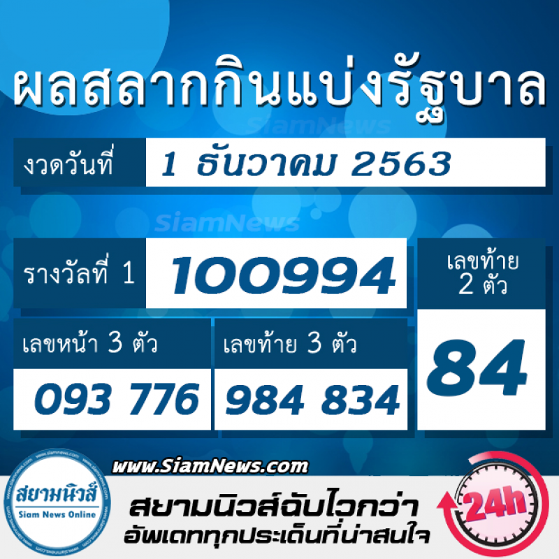 ผ่านไปแล้วสำหรับการประกาศผลสลากกินแบ่งรัฐบาล ประจำวันที่ 1 ธันวาคม 2563 รางวัลที่ 1 ออกหมายเลข 100994 ส่วนรางวัล เลขหน้า 3 ตัว ออกหมายเลข 093 และ 776 รางวัลเลขท้าย 3 ตัว ออกหมายเลข 984 และ 834 ขณะที่รางวัลเลขท้าย 2 ตัว ออกหมายเลข 84 เชื่อว่าหลายท่านคงจะกำลังเฮเตรียมเลี้ยงฉลอง
