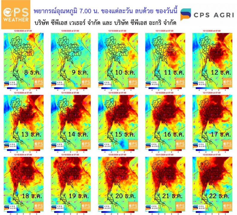 เตรียมอุ่นขึ้น จะพลิกจากน้ำเงินเป็นแดง 11 ธ.ค. ทยอยอุ่นขึ้นตะวันออกของอีสาน, 12 ธ.ค. เป็นต้นไปเริ่มเข้าธีมแดงยิงยาวถึง 22 ธ.ค. รูปเหล่านี้เป็นผลการพยากรณ์อุณหภูมิเวลา 7.00 น. ของแต่ละวัน ลบด้วย อุณหภูมิเวลา 7.00 น. ของวันนี้ 7 ธ.ค. รายละเอียดของแต่ละวันดูได้ตามรูปเลยครับ