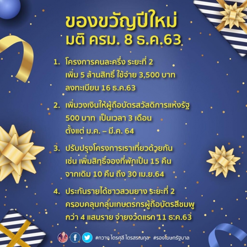 ล่าสุดนั้นทางเพจ กวาง ไตรศุลี ไตรสรณกุล รองโฆษกประจำสำนักนายกรัฐมนตรี ได้สรุปของขวัญปีใหม่ มติ ครม. 8 ธ.ค.63