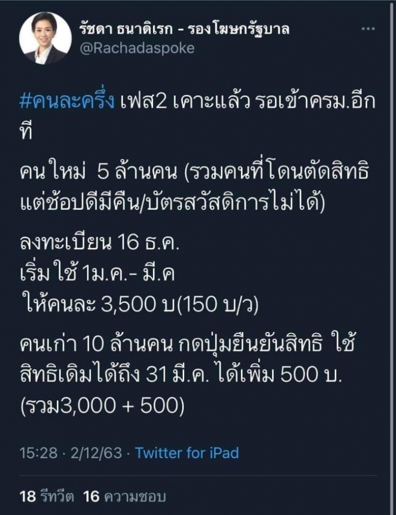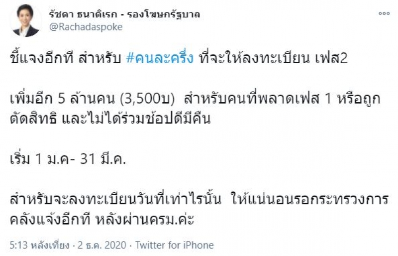 ชี้แจงอีกที สำหรับ คนละครึ่ง ที่จะให้ลงทะเบียน เฟส2เพิ่มอีก 5 ล้านคน (3,500บ) สำหรับคนที่พลาดเฟส 1 หรือถูกตัดสิทธิ และไม่ได้ร่วมช้อปดีมีคืน