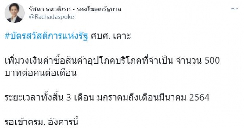 บัตรสวัสดิการแห่งรัฐ ศบศ. เคาะเพิ่มวงเงินค่าซื้อสินค้าอุปโภคบริโภคที่จำเป็น จำนวน 500 บาทต่อคนต่อเดือน ระยะเวลาทั้งสิ้น 3 เดือน มกราคมถึงเดือนมีนาคม 2564