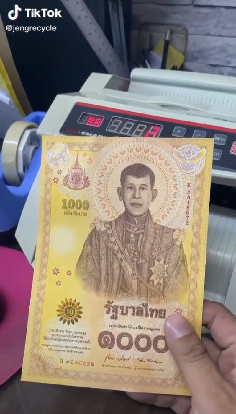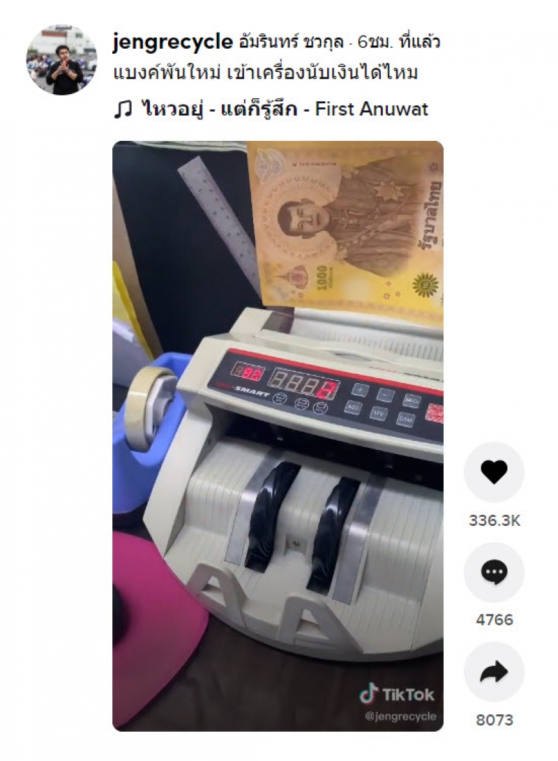 แต่ที่หลายคนให้ความสนใจคือ ธนบัตร ฉบับละ 1,000 บาท ที่มีขนาดกว้างกว่าธนบัตรปกติเกือบ 2 เท่า โดยบางคนก็สงสัยว่า อย่างนี้หากนำเข้าเครื่องนับเงิน จะมีผลอย่างไร ซึ่งล่าสุด ผู้ใช้งาน TikTok @jengrecycle ได้เผยคลิปวิดีโอ พร้อมระบุว่า