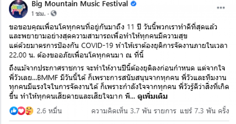 หลังจากที่ทุกคนรอคอยคำแถลงจากเพจ BMMF ที่จัดงานบิ๊กเมาน์เท่น ว่าสรุปจะเป็นอย่างไรต่อ หลังจากที่ผู้ว่าราชการจังหวัดนครราชสีมา ได้สั่งให้ยุติการจัดคอนเสิร์ตดังกล่าว ซึ่งมองว่าผู้จัดงานไม่ปฏิบัติตามมาตรการป้องกันควบคุมโรคโควิด-19 ล่าสุดทางเพจก็ได้ออกมาโพสต์ข้อความแล้วว่า