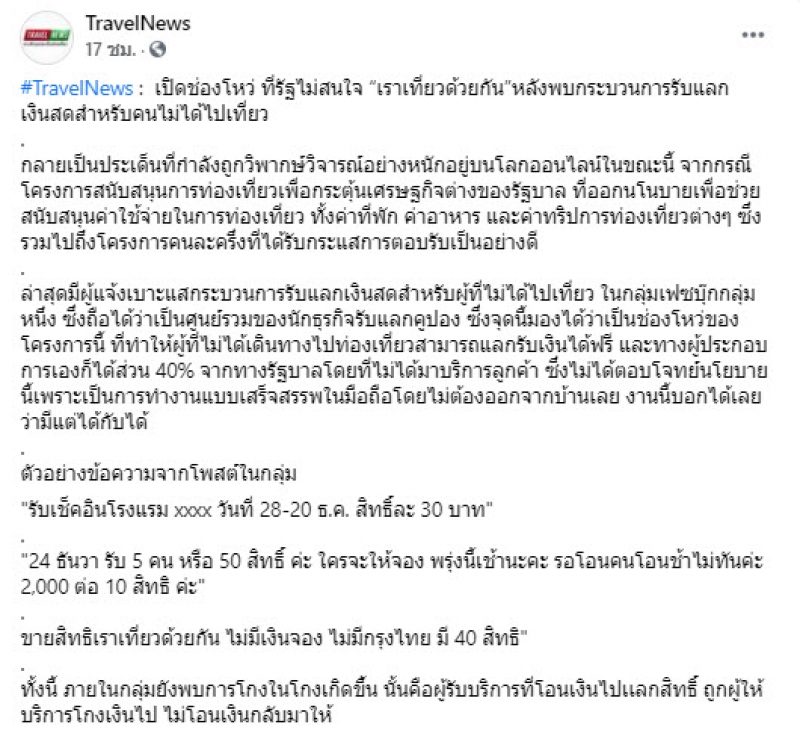 ล่าสุดกลายเป็นประเด็นที่วิพากษ์วิจารณ์อย่างหนัก เมื่อมีผู้แจ้งเบาะแสกระบวนการรับแลกเงินสดในโครงการนี้สำหรับผู้ที่ไม่ได้ไปเที่ยว โดยเฟซบุ๊กกลุ่มหนึ่ง เป็นศูนย์ของนักธุรกิจรับแลกคูปอง ซึ่งจะใช้ช่องโหว่ของเงื่อนไขโครงการ