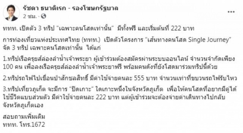 น.ส.รัชดา ธนาดิเรก รองโฆษกรัฐบาล โพสต์ข้อความเปิดเผย ความคืบหน้าโครงการทริปคนโสดโดยมีททท.มติเป็นโครงการออกมาแล้ว เป็น 3 โครงการดังนี้ททท. เปิดตัว 3 ทริป “เฉพาะคนโสดเท่านั้น” มีทั้งฟรี และเริ่มต้นที่ 222 บาทการท่องเที่ยวแห่งประเทศไทย (ททท.) เปิดตัวโครงการ “เส้นทางคนโสด Single Journey” จัด 3 ทริป เฉพาะคนโสดเท่านั้น ได้แก่