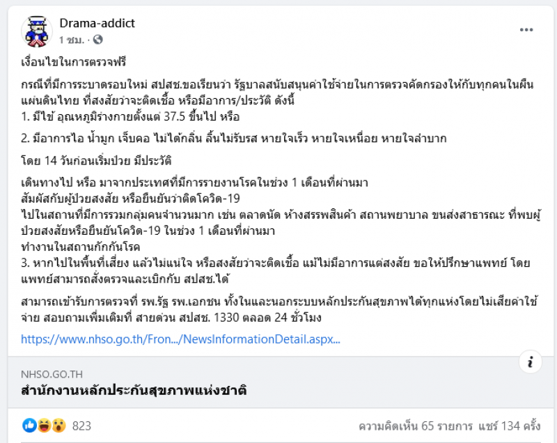 เมื่อวันที่ 22 ธันวาคม 2563 เพจ Drama-addict ได้ชี้แจงแถลงไขเกี่ยวกับเรื่องดังกล่าวว่า เงื่อนไขในการตรวจฟรี สปสช.ขอเรียนว่า รัฐบาลสนับสนุนค่าใช้จ่ายในการตรวจคัดกรองให้กับทุกคนในผืนแผ่นดินไทย ที่สงสัยว่าจะติดcv หรือมีอาการประวัติ ดังนี้