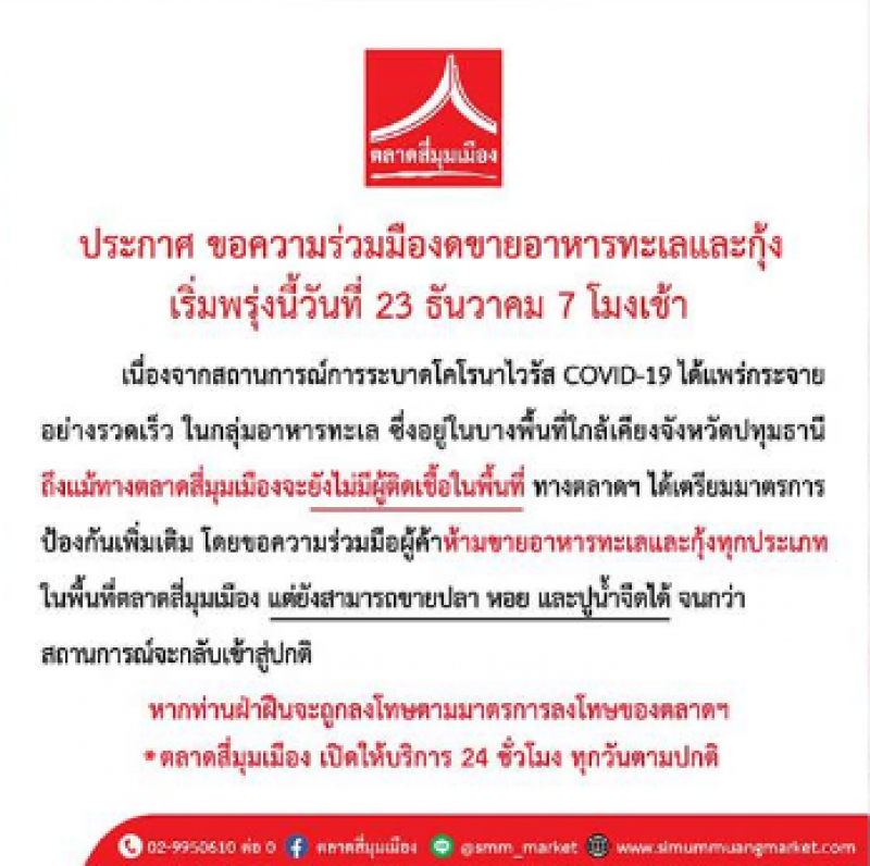จากกรณีแฟนเพจเฟซบุ๊ก ตลาดสี่มุมเมือง ได้โพสต์ข้อความโดยระบุว่า ประกาศตลาดสี่มุมเมืองขอความร่วมมืองดขายอาหารทะเลและกุ้ง นอกจากนี้ยังได้โพสต์ที่ระบุข้อความว่า ตลาดสี่มุมเมือง ประกาศ ขอความร่วมมืองดขายอาหารทะเลและกุ้ง เริ่มพรุ่งนี้วันที่ 23 ธันวาคม 7 โมงเช้า เนื่องจากสถานการณ์การcv ได้แพร่กระจายอย่างรวดเร็ว ในกลุ่มอาหารทะเล ซึ่งอยู่ในบางพื้นที่ใกล้เคียงจังหวัดปทุมธานี