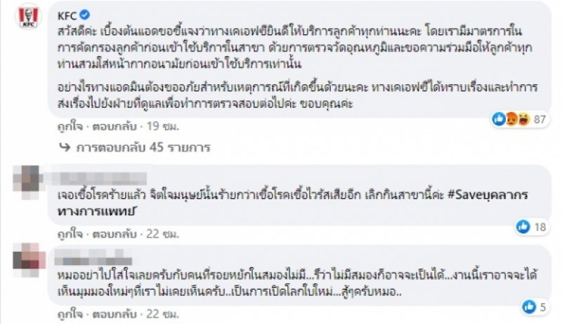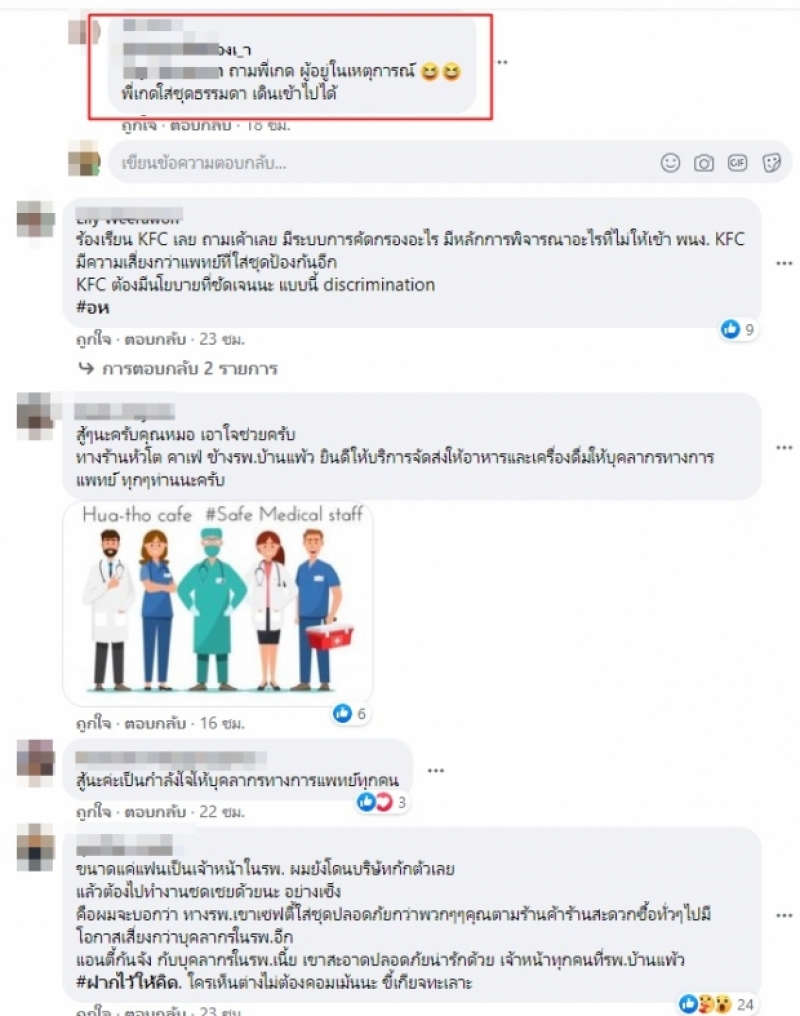 เป็นที่วิพากษ์วิจารณ์อย่างหนักในโลกออนไลน์ กรณีผู้ใช้เฟซบุ๊กรายหนึ่ง ออกมาโพสต์ถึงพฤติกรรมของพนักงานร้านไก่ทอดชื่อดัง ที่ปฏิเสธการให้บริการเพราะ เห็นเป็นบุคลากรทางแพทย์ เพราะหวั่นกลัวcv โดยผู้โพสต์ระบุว่า