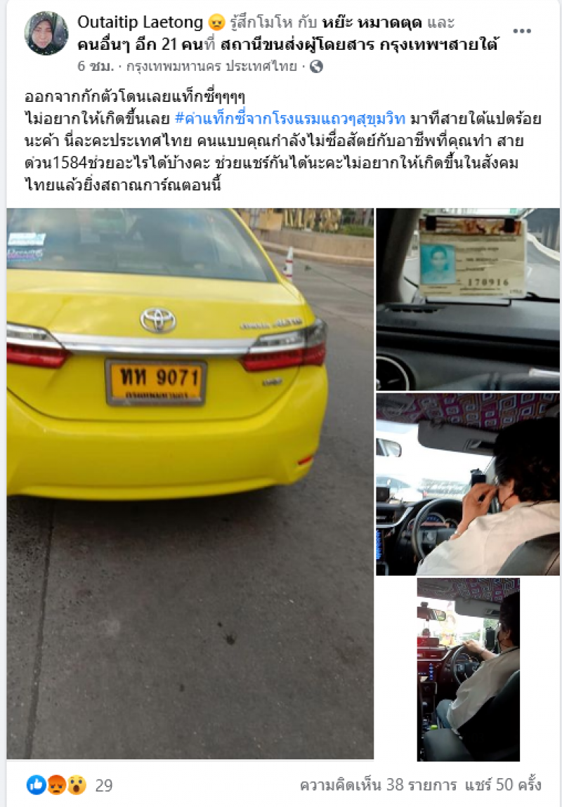 ออกจากกักตัวโดนเลยแท็กซี่ๆๆๆๆไม่อยากให้เกิดขึ้นเลย #ค่าแท็กซี่จากโรงแรมแถวๆสุขุมวิท มาทีสายใต้แปดร้อยนะค้า นี่ละคะประเทศไทย คนแบบคุณกำลังไม่ซื่อสัตย์กับอาชีพที่คุณทำ สายด่วน1584ช่วยอะไรได้บ้างคะ ช่วยแชร์กันได้นะคะไม่อยากให้เกิดขึ้นในสังคมไทยแล้วยิ่งสถาณการ์ณตอนนี้