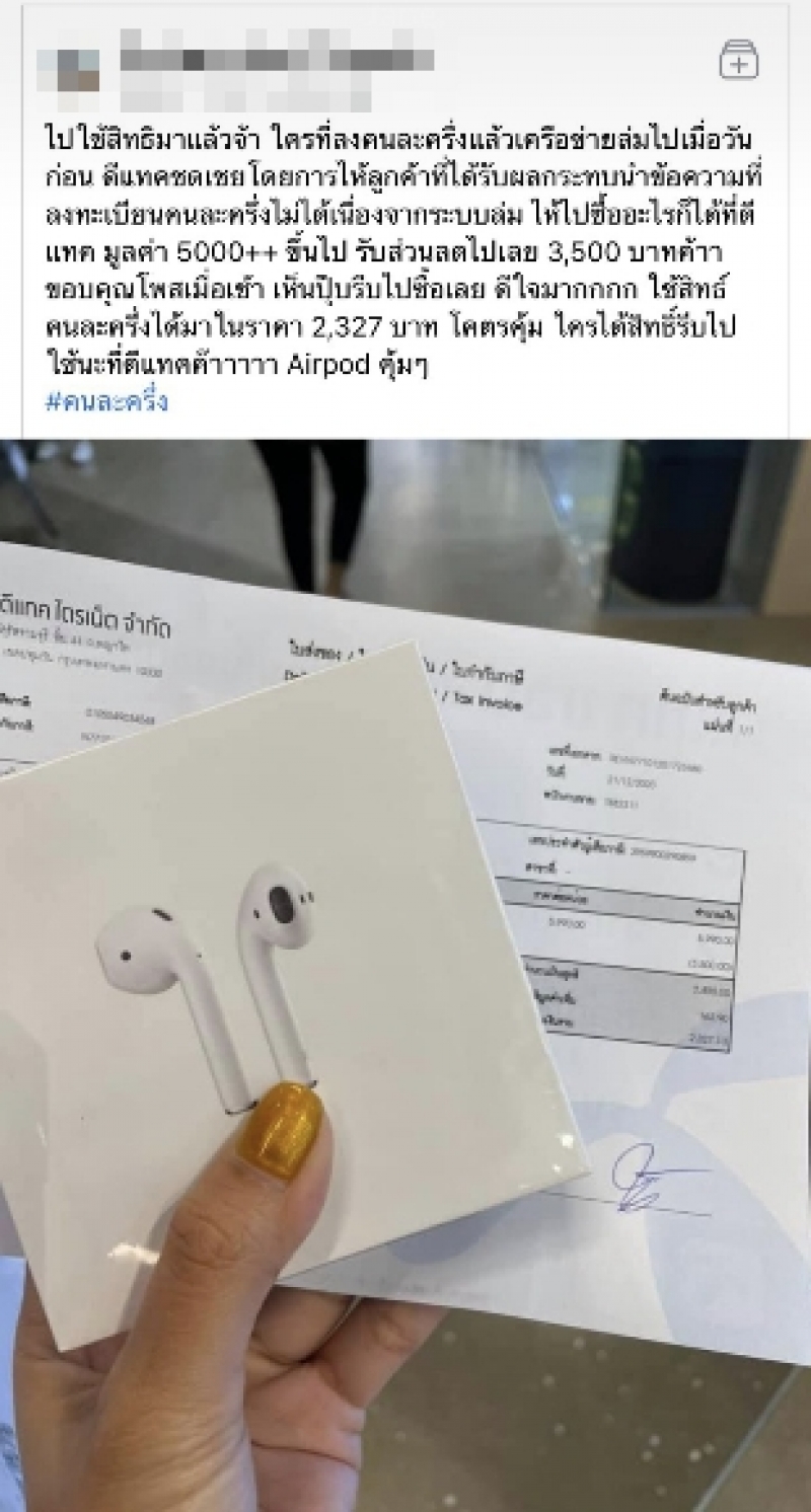 สาวไปถอย AirPods หลังดีแทคชดเชยให้ กรณีลงทะเบียนคนละครึ่งล่ม รับส่วนลดทันที 3,500