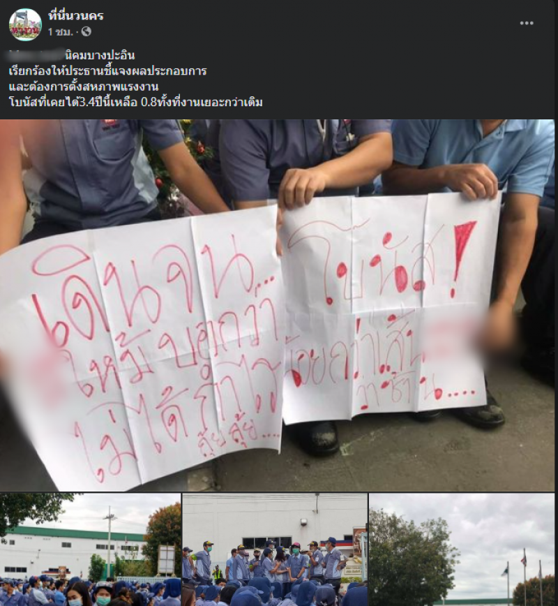 วันที่ 25 ธ.ค. 63 เพจ ที่นี่นวนคร ได้ออกมาเผยภาพพนักงานโรงงานแห่งหนึ่งที่กำลังรวมตัวกันประท้วงเพื่อเรียกร้องขอโบนัสกับบริษัทเพิ่ม จากที่เคยจะต้องได้ 3.4 ในปีนี้ กลายเป็นได้จริงเพียง 0.8 เท่านนั้นทั้งยังต้องทำงานหนักกว่าเดิม โดยทางเพจได้ระบุข้อความประกอบภาพว่า