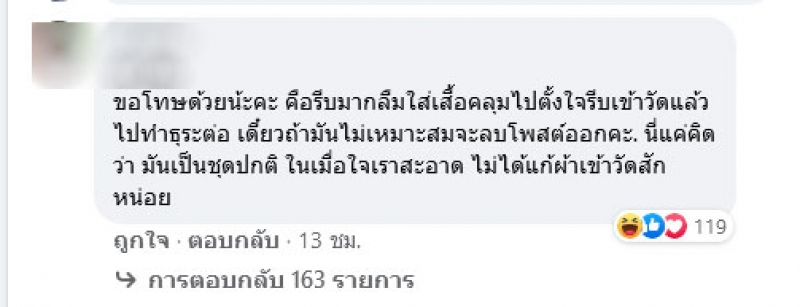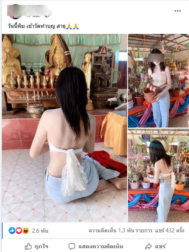 เรียกได้ว่าเป็นอีกหนึ่งเหตุการณ์ที่โซเชียลแห่วิพากษ์วิจารณฺ์กันเป็นจำนวนมาก หลังมีผู้ใช้เฟสบุ๊ครายหนึ่งได้ออกมาโพสต์ภาพหลังเข้าวัดทำบุญ แต่งานนี้ทำเอาชาวโซเชียลถล่มยับ กับชุดที่เธอนั้นใส่ไปวัดซึ้งไม่เหมาะสมเอามากๆ ทั้งนี้ผู้ใช้เฟสบุ๊คดังกล่าวยังได้ระบุข้อความว่า