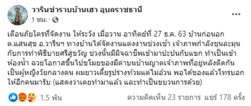 เตือนภัยใครที่จัดงาน ให้ระวัง เมื่อวาน อาทิตย์ที่ 27 ธ.ค. 63 บ้านก่อนอก ต.แสนสุข อ.วารินฯ ทางบ้านได้จัดงานแต่งงานช่วงเช้า เจ้าภาพกำลังชุนละมุนกับการทำพิธีบายศรีสู่ขวัญ ช่วงนั้นมีมิจฉาชีพเข้ามาปะปนกับแขก ทำเป็นเข้าห้องน้ำ ฉวยโอกาสขึ้นไปขโมยของมีค่าบนบ้านญาติเจ้าภาพที่อยู่หลังติดกัน เป็นผู้หญิงวัยกลางคน ผมยาวเตี้ยรูปร่างท้วมแต่ไม่อ้วน พอได้ของแล้วโทรบอกให้อีกคนมารับ (แสดงว่าเคยทำมาแล้ว และทำเป็นขบวนการด้วย