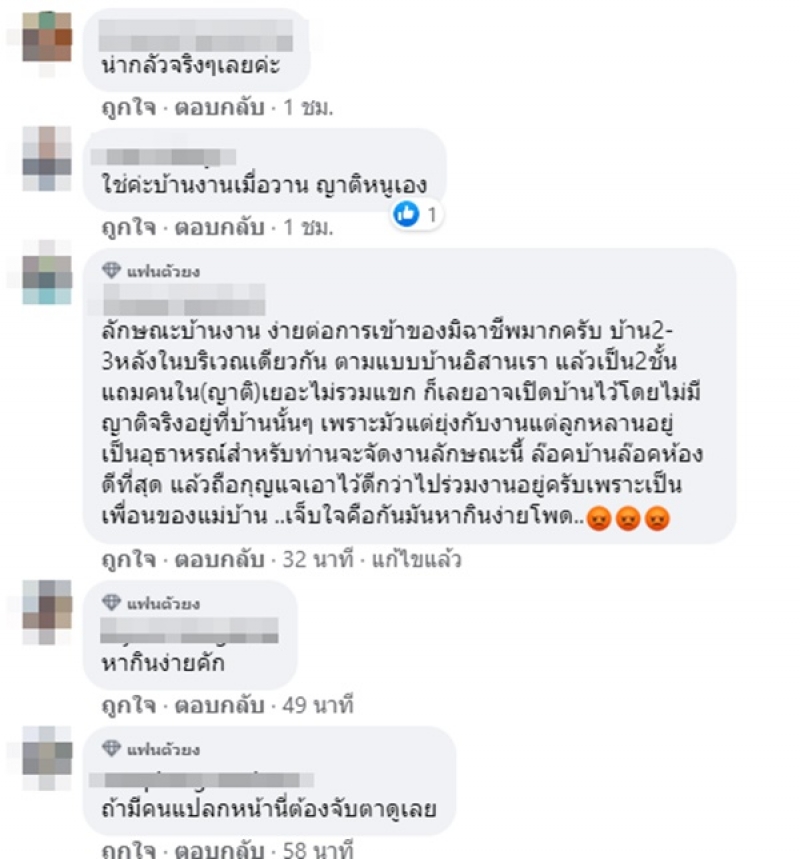 หลังจากที่เรื่องราวนี้มีการเผยแพร่ออกไป ได้มีผู้เข้ามาแสดงความคิดเห็นเป็นจำนวนมาก โดยต่างบอกว่าเหตุการณ์ดังกล่าวเป็นเรื่องที่น่ากลัว หากินบนความรู้สึกของคนอื่น, บางคนเข้ามาบอกว่าเหตุการณ์นี้คือเหตุการณ์ที่เกิดขึ้นกับบ้านญาติของตนเอง, ขณะที่คนไปร่วมงานแต่งงานนี้บอกว่าลักษณะบ้านงาน ง่ายต่อการเข้าของมิฉาชีพมากบ้าน2-3หลังในบริเวณเดียวกัน ตามแบบบ้านอีสานเรา แล้วเป็น2ชั้นแถมคนใน(ญาติ)เยอะไม่รวมแขก ก็เลยอาจเปิดบ้านไว้โดยไม่มีญาติจริงอยู่ที่บ้านนั้นๆ เพราะมัวแต่ยุ่งกับงานแต่ลูกหลานอยู่ เป็นอุทาหรณ์สำหรับท่านจะจัดงานลักษณะนี้