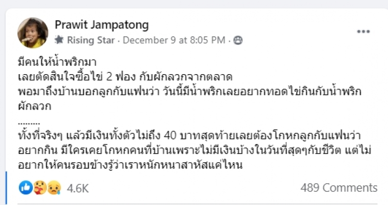 โดยเจ้าตัวได้ระบุข้อความว่า มีคนให้น้ำพริกมา เลยตัดสินใจซื้อไข่สองฟองกับผักลวกจากตลาดพอมาถึงบ้านบอกลูกกับแฟนว่า วันนี้มีน้ำพริกจึงเลยอยากทอดไข่กินกับน้ำพริกผักลวก ทั้งที่จริงๆ แล้วมีเงินไม่ถึง 40บาท