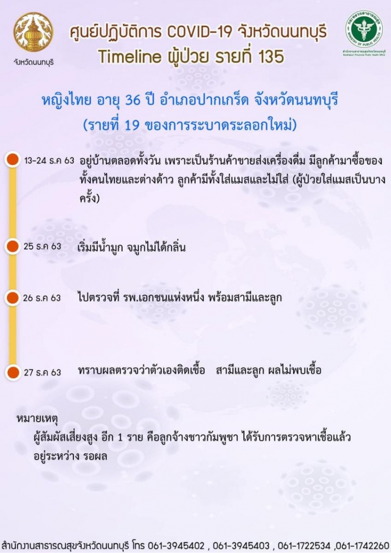 ผู้ติด รายที่ 135 (รายที่ 19 รอบใหม่) จ.นนทบุรี หญิงไทย อายุ 36 ปี ที่อยู่ อำเภอปากเกร็ด จังหวัดนนทบุรี
