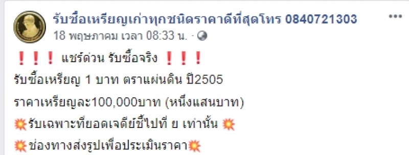 ร้านโพสต์ประกาศรับซื้อเหรียญรุ่นเก่า ให้สูงสุดเหรียญละ 100,000