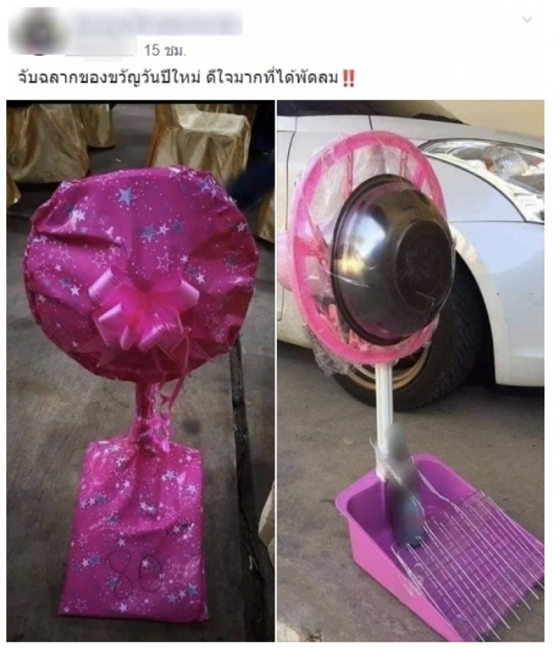 เรียกได้ว่าเป็นอีกหนึ่งเรื่องราวที่โซเชียลเข้ามาแสดงความเห็นกันเป็นจำนวนมาก หลังมีผู้ใช้เฟสบุ๊ครายหนึ่งได้ออกมาโพสต์ภาพหลังได้จับของขวัญปีใหม่ เช่นเดียวกับเรื่องราวดังต่อไปนี้ เมื่อในโลกออนไลน์ได้มีการเผยแพร่ภาพของขวัญสุดเซอร์ไพรส์ สำหรับคนงบน้อย ที่เห็นแวบแรกใครๆก็ต้องคิดว่าเป็นพัดลมอย่างแน่นอน ก่อนจะเปิดดูข้างใน
