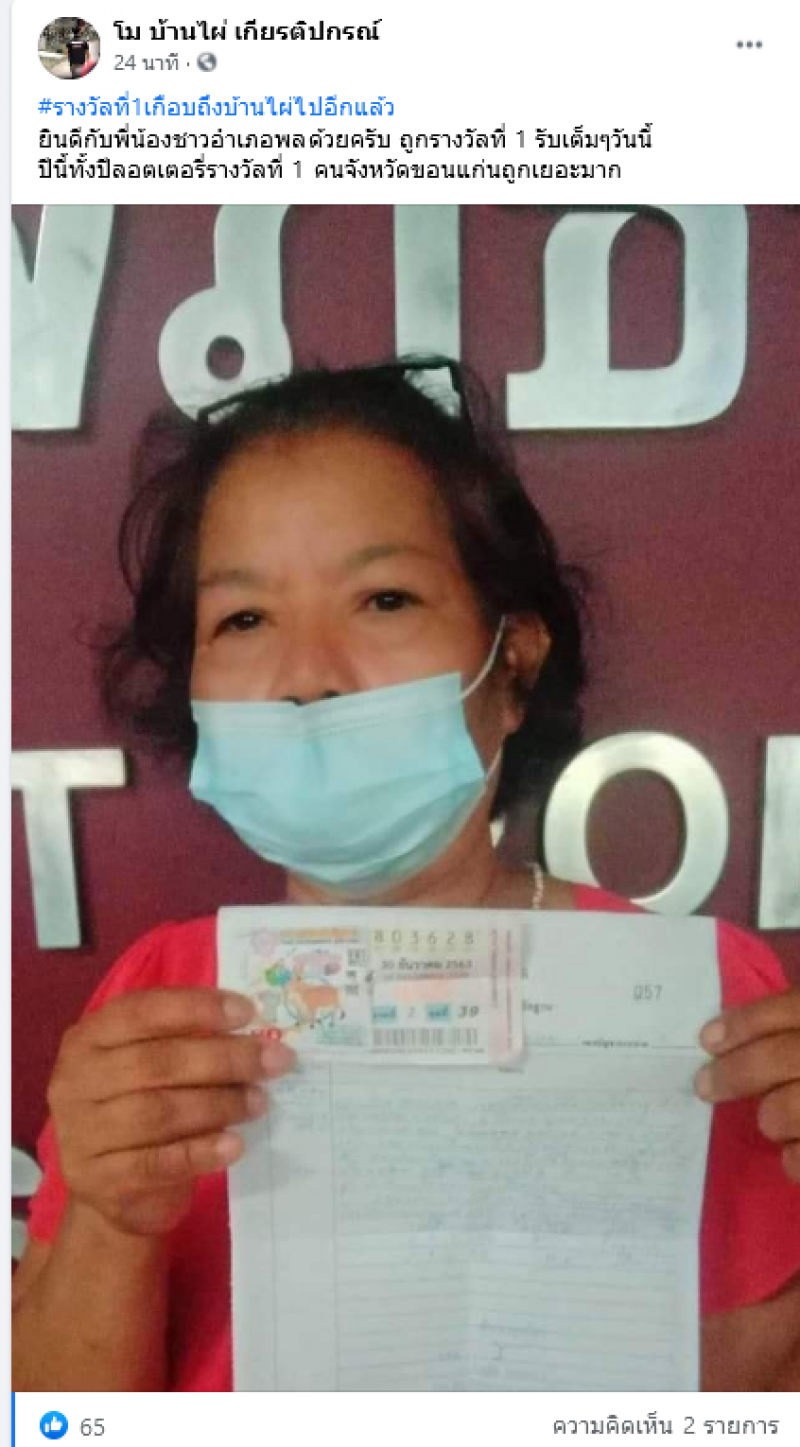 ล่าสุดพบสาวใหญ่ท่านหนึ่งถูกรางวัลที่ 1 โดยผู้ใช้เฟสบุ๊ค โม บ้านไผ่ เกียรติปกรณ์ ดังกล่าวได้ระบุข้อความว่า