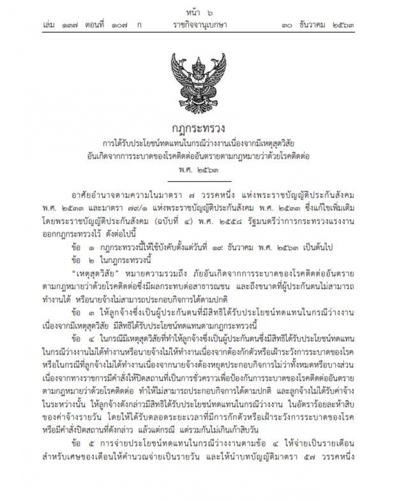 เว็บไซต์ราชกิจจานุเบกษา ได้ออกประกาศเผยแพร่ กฎกระทรวงการได้รับประโยชน์ทดแทนในกรณีว่างงานเนื่องจากมีเหตุสุดวิสัย อันเกิดจาก ติดต่ออันตรายตามกฎหมายว่าด้วยติดต่อ พ.ศ. 2563 โดย นาย สุชาติ ชมกลิ่น รัฐมนตรีว่าการกระทรวงแรงงาน ลงวันที่ 30 ธันวาคม 2563 ความว่า