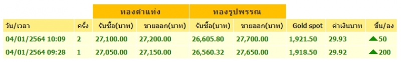 ราคาทองวันนี้จันทร์ที่ 4 มกราคม 2564 ประกาศราคาครั้งที่ 2 เมื่อเวลา 10.09 น. ปรับขึ้นอีก 50 บาท รวมวันนี้ปรับขึ้น 250 บาท