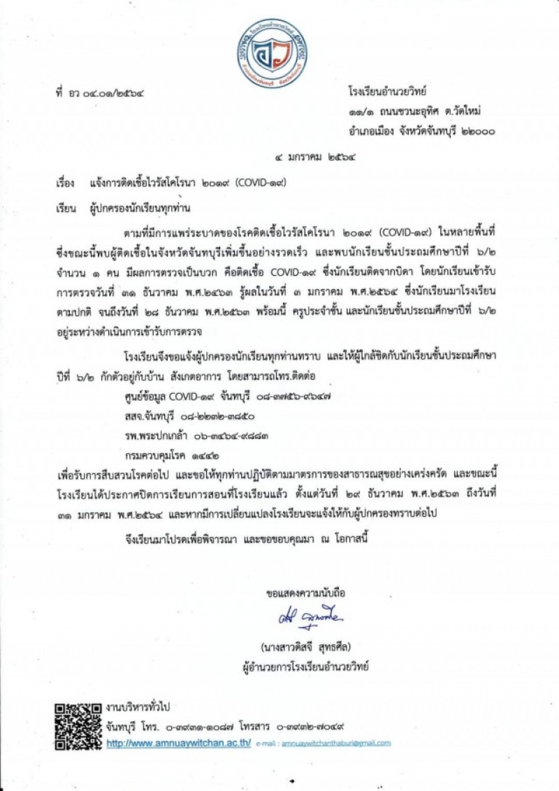 เพื่อรับการสืบสวนต่อไป และขอให้ทุกท่านปฏิบัติตมมาตรการของสาธารณสุขอย่างเคร่งครัด และขณะนี้ โรงเรียนได้ประกาศปิดการเรียนการสอนที่โรงเรียนแล้ว ตั้งแต่วันที่ ๒๙ ธันวาคม พ.ศ.๒๕๖๓ ถึงวันที่ ๓๑ มกราคม พ.ศ.๒๕๖๔ และหากมีการเปลี่ยนแปลงโรงเรียนจะแจ้งให้กับผู้ปกครองทราบต่อไปจึงเรียนมาโปรดเพื่อพิจรณา และขอขอบคุณมา ณ โอกาสนี้