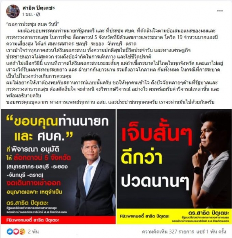 ผมไม่อยากให้เราต้องพบกับสถานการณ์แบบนั้นครับ ขอให้ทุกคนเข้าใจ ถึงปัจจัยหลายๆด้านที่รัฐบาลและกระทรวงสาธารณสุข ต้องตัดสินใจ จะตำหนิ จะวิพากษ์วิจารณ์ อย่างไร ผมพร้อมรับคำวิจารณ์เหล่านั้น และพร้อมอธิบายครับ ขอบพระคุณบุคลากร ทางการแพทย์ทุกท่าน อสม. และประชาชนทุกคนครับ เราจะผ่านมันไปด้วยกันครับ