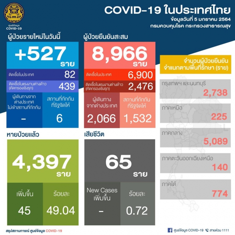 วันที่ 5 ม.ค. 64 ศบค. รายงานสถานการณ์ในประเทศไทย ล่าสุด พบผู้ติด cv รายใหม่