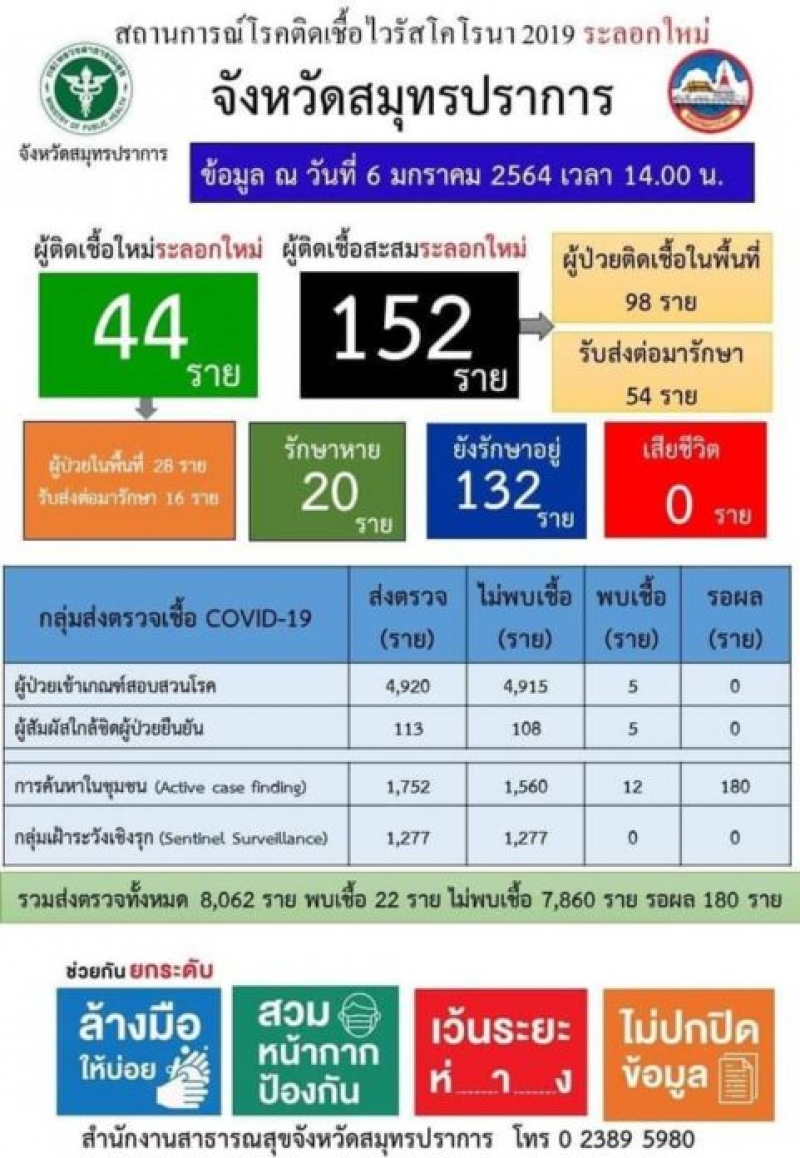เมื่อเวลา 14.00 น. วันที่ 6 ม.ค.64 ในจ.สมุทรปราการ พบผู้ติดรายใหม่ 44 ราย แยกเป็นผู้ติดในพื้นที่ 28 ราย และรับส่งต่อมารักษา 16 ราย