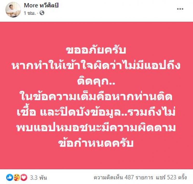 จากการแถลงนี้ทำให้มีการวิพากษ์วิจารณ์กันไปต่างๆนานาว่าหากไม่โหลดแอพพลิเคชั่นไว้จะต้องรับโทษอย่างนั้นหรือ ล่าสุด นพ.ทวีศิลป์ จึงได้ออกมาโพสต์ชี้แจงล่าสุด ขอโทษที่ทำให้เข้าใจผิด ระบุดังนี้